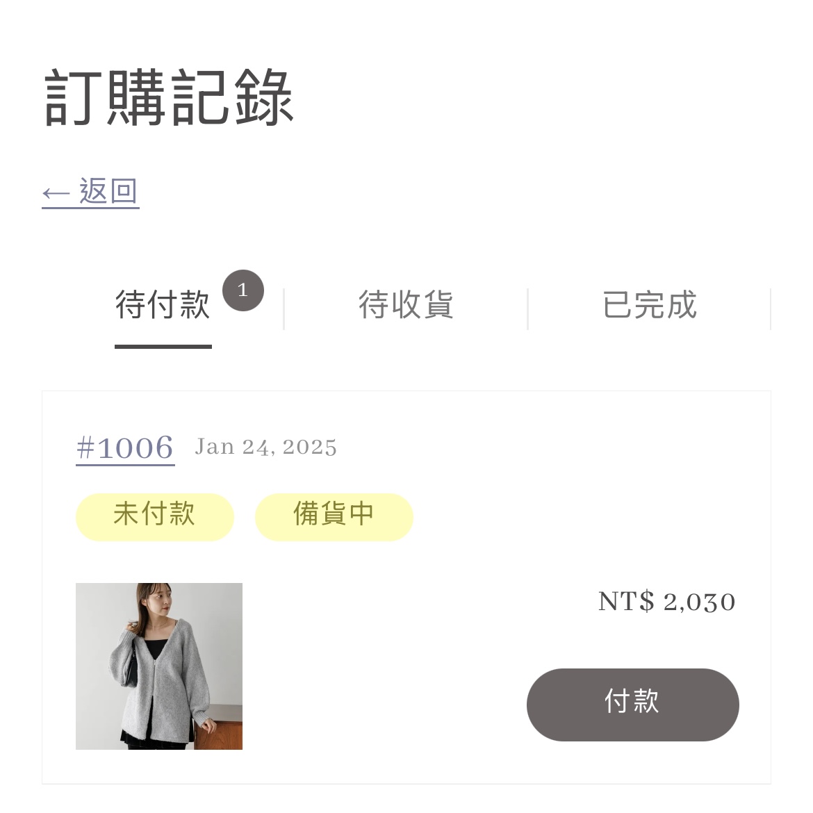 2.進入到訂購紀錄頁面後,點選付款進入。